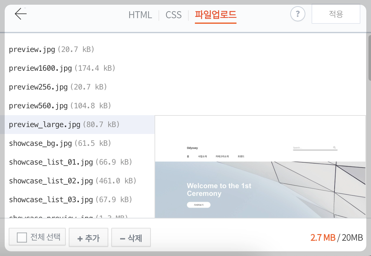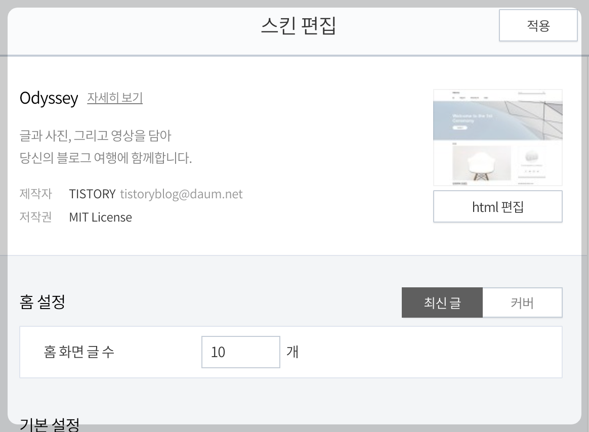 위 사진과 같은 스킨편집 화면에서 'html편집' 버튼을 누릅니다.