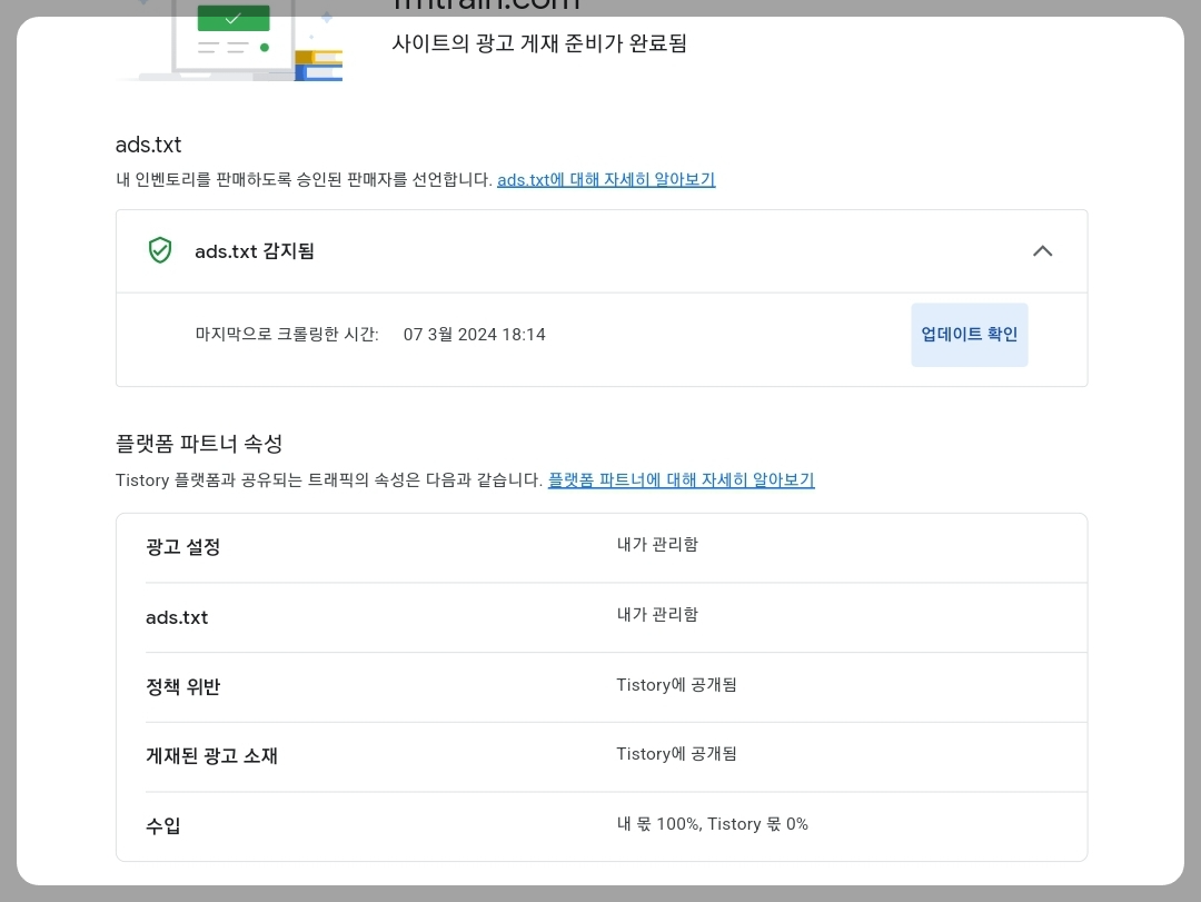 - 연동 후에 구글 애드센스에 다시 접속 후 ads.txt 지금 해결하기 누르신 후 업데이트 확인 버튼 누르시면 ads.txt 문제가 해결됩니다.