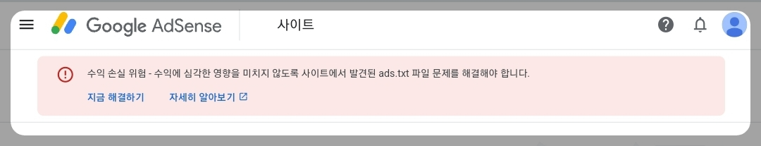 보통 다른 블로그에서는 이렇게만 한 후 2~3일 후 적용된다고 하는데, 도메인을 구매하여 개인 도메인으로 블로그를 운영하는 경우는 업로드한 ads.txt파일을 읽을 수 있는 권한이 구글 애드센스에게는 없어서 여전히 해결되지 않습니다.