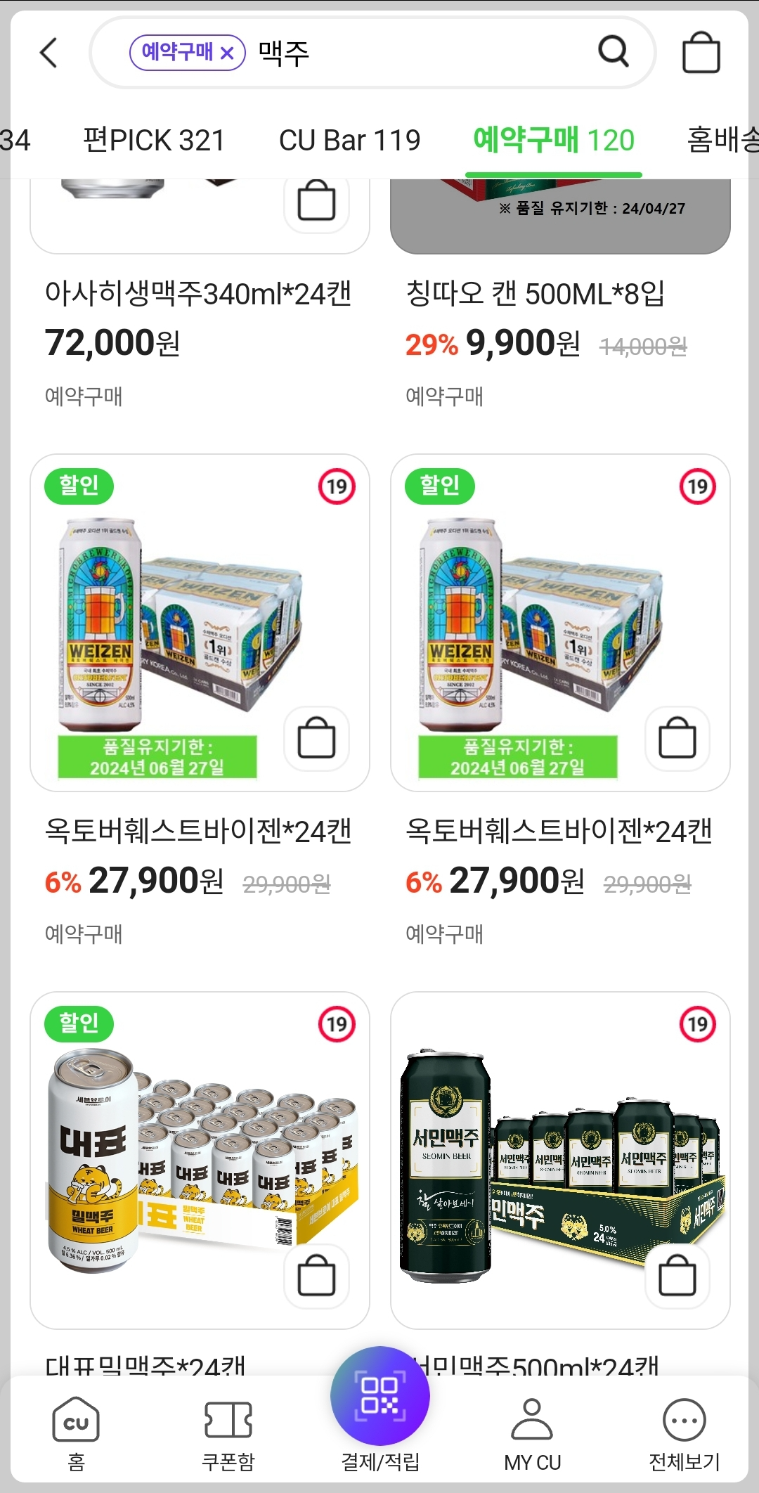 4. 검색 후 [예약구매] 페이지에서 할인 된 초저가 맥주를 선택합니다.